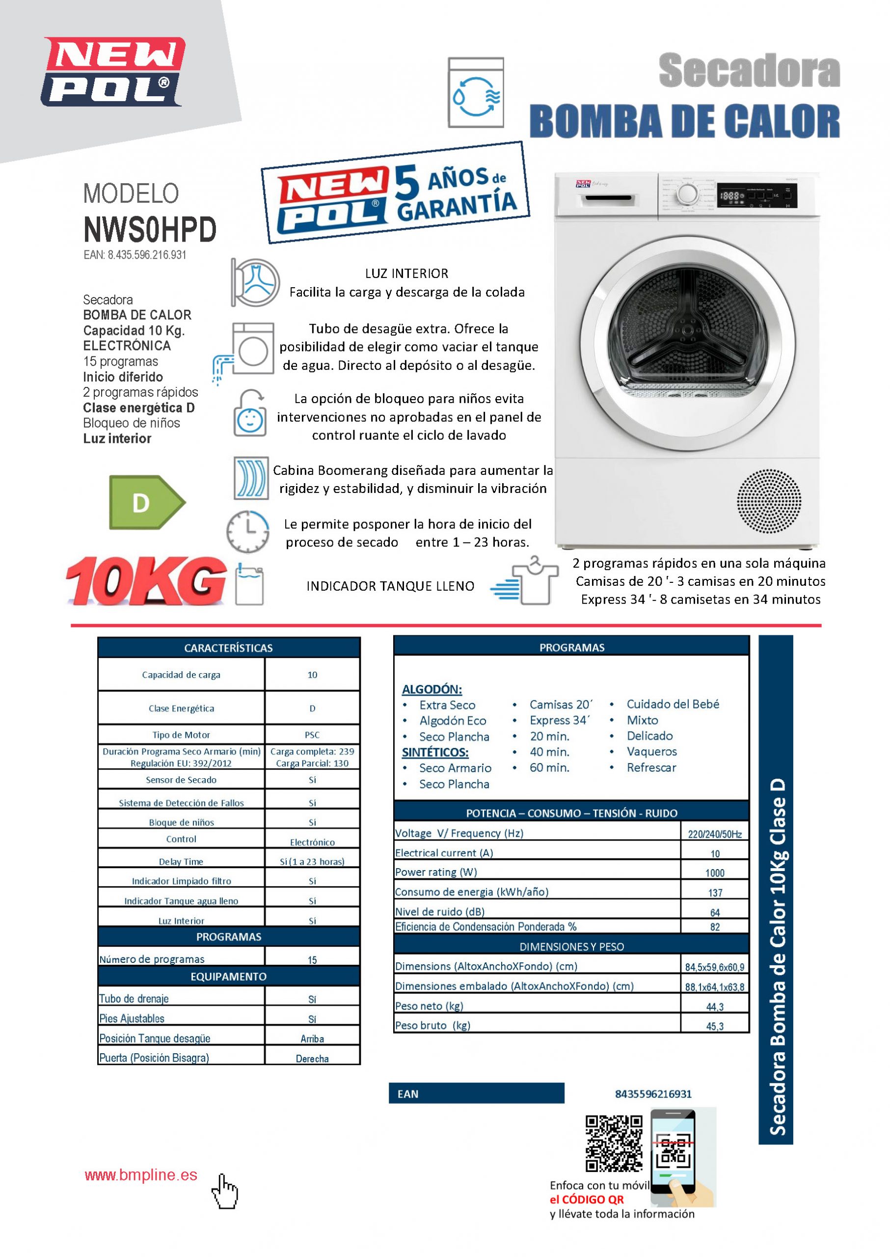 Secadora Bomba de calor 10Kg. Electrónica. D. Luz interior. Black display