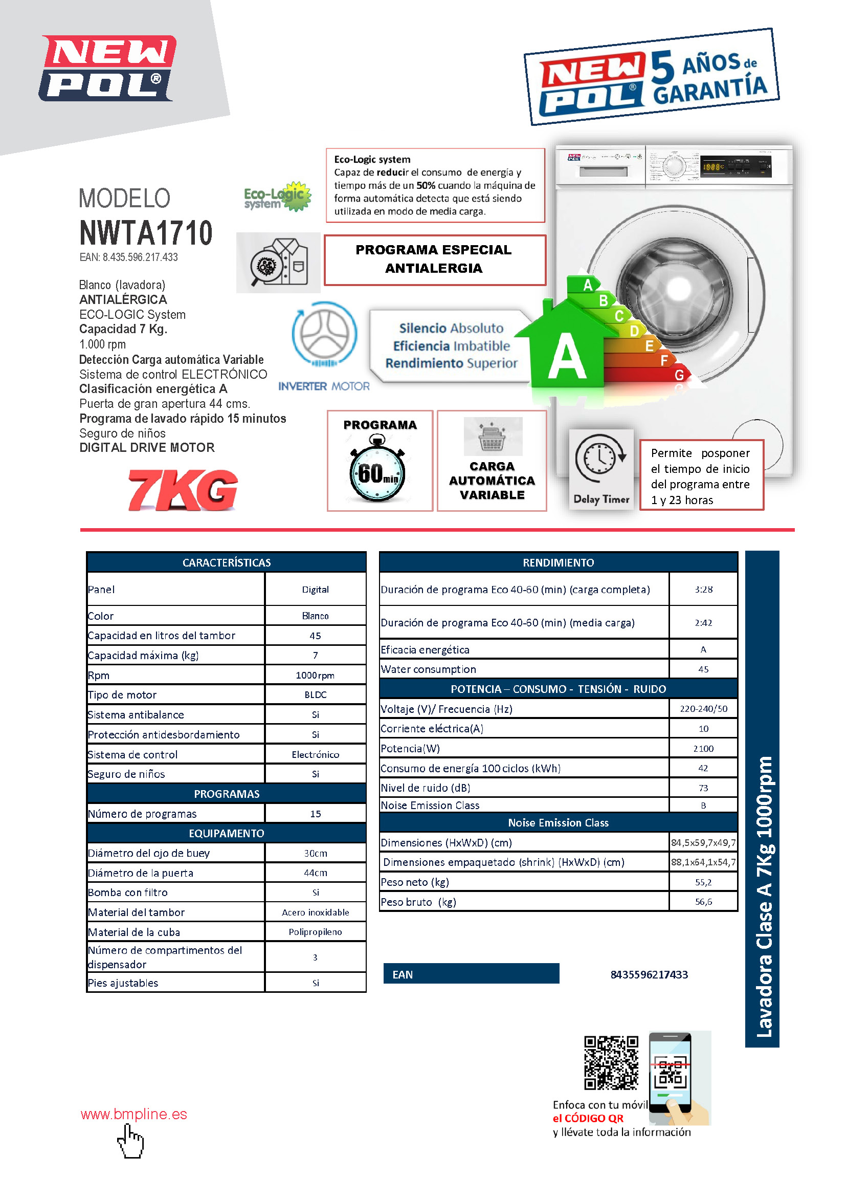 Lavadora 7Kg, 1000rpm, D, ANTIALÉRGICA, Black display